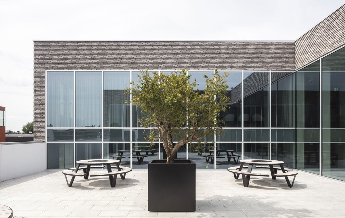 Voor de buitenruimte kozen de architecten resoluut voor de krachtige Pantagruel zitbanken van Extremis. Deze iconische, robuuste tafels met geïntegreerde zitbanken combineren duurzaamheid met sociale interactie en sluiten perfect aan bij een publieke context waar ontmoeting en informele dialoog centraal staan. Hun sculpturale aanwezigheid geeft het plein en de buitenzones een duidelijke identiteit.